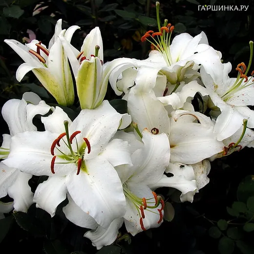 Лилия Сиберия восточная - Многолетнее луковичное растение с прямыми и крепкими облиственными стеблями. Высота до 100 см. Цветки до 22 см в диаметре, чашевидные, белые. Края лепестков волнистые, кончики сильно загнуты. В соцветии 3-8 цветков, направленных вверх и в сторону. Сорт подходит для срезки . Очень красивый сорт, с приятным ароматом, обычно именно его используют в свадебных букетах. Восточные лилии желательно укрывать на зиму в Средней полосе, но этот сорт характеризуют, как довольно зимостойкий.