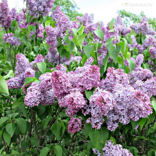 Сирень Русская Песня - среднерослый кустарник, достигающий 3 м в высоту и 2.5 м в ширину. Годовой прирост объема — 30 см. Листья сердцевидной формы, темно-зеленые, с заостренным кончиком. Русская Песня отличается махровыми цветками лилово-сиреневых оттенков. Они собраны в плотные конические соцветия. Цветение с мая по июнь. Цветы не выгорают на солнце.