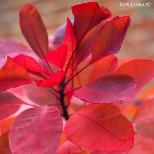 Скумпия Грейс - Листопадный кустарник высотой до 3 (5) м с красивой густой округлой кроной и душистой жёлтой древесиной. Молодые побеги светло-коричневые или красные, старая кора бурая, мелкотрещиноватая. Листья очерёдные, простые, плотные, почти кожистые, округло-яйцевидные, до 8 см длиной, сверху сизозелёные, снизу светлее. Осенью окрашиваются в жёлтые, розовые или багрово-фиолетовые цвета.