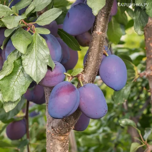 Слива Поздняя красавица - Созревает в поздний срок - в 1 декаде сентября. Плоды крупные, 40 - 50 г, овальные, фиолетовые с синим налётом, мякоть желтая, сочная, кисловато - сладкая, хорошего вкуса. Косточка свободно отделяется от мякоти. Вступает в плодоношение на четвертый год после посадки. Дерево средней величины с компактной густой кроной, с характерной волнистостью краев листьев. Очень зимостойкий и урожайный сорт.Сорт универсального назначения