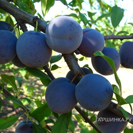 Слива Ренклод Тамбовский - Деревья отличаются среднерослостью, в высоту достигают обычно 3-4-х метров. Формируют раскидистую округло-овальную крону, близкую по форме к шару. Скороплодность “Ренклода Тамбовского” средняя, первые цветы и плоды на деревьях появляются на 3-4 год после посадки. Слива “Ренклод Тамбовский” даёт округло-овальные плоды средних размеров. Цвет кожицы в период полного созревания тёмно-фиолетовый, но она густо покрыта сине-сизым восковым налётом, от чего фрукты могут выглядеть ярко-фиолетовыми. Цвет мякоти контрастный, зеленовато-жёлтых оттенков.