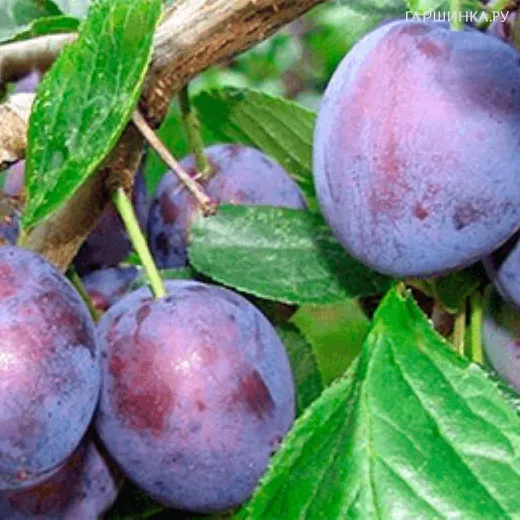 Плоды от мелкого до среднего размера, массой от 15 до 28 грамм, округло-овальной или яйцевидной ассиметричной формы. Окрас плодов — темный фиолетово-красный. Кожица толстая, грубая, покрыта густым синевато-фиолетовым восковым налетом, на вкус слегка горчит. Брюшной шов выражен отчетливо. Воронка средней глубины и ширины. Плодоножка тонкая, средней длины. Косточки средней величины, удлиненно-овальной формы, свободные, от мякоти отделяются хорошо. Мякоть янтарно-желтой окраски, грубой консистенции, плотной структуры, сочная, вкус — посредственный, кисло-сладкий. Сливы употребляются в свежем виде, но преимущественно в переработанном (повидло, компоты, варенье, сушка). Транспортировку плоды переносят хорошо.