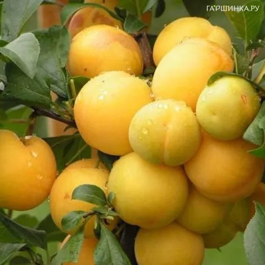 Плоды округлой формы, среднего размера (средняя масса 20-30 г), желтой окраски, с восковым налетом. Кожица плотная, что хорошо сказывается на транспортабельности плодов. Созревают плоды в середине августа. Мякоть светло-желтая, средней плотности и сочности, аромат тонкий. Вкусовые качества хорошие. Транспортабельность и лежкость хорошая. Высокая урожайность обусловлена крупными размерами дерева.