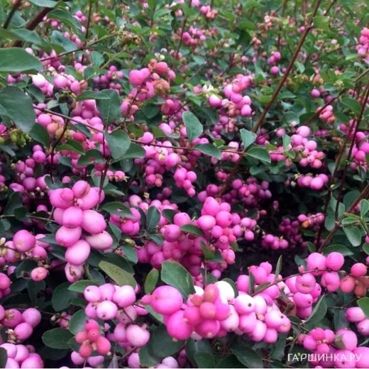 Снежноягодник Мэджик Берри - Плотный кустарник с дуговидными побегами, высота 90-100 и ширина 100-120 см. Листья тёмно-зелёные. Цветки розоватые невзрачные, цветёт в июне. Плоды - многочисленные округлые пурпурно-розовые ягоды, сохраняющиеся на кусте до зимы.