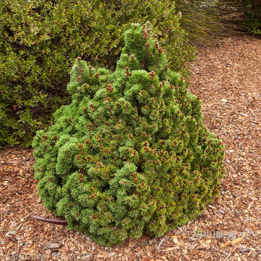 Сосна горная Альгау - хвойное, карликовое растение. В возрасте примерно 10 лет высота 0,6 м, диаметр 1,0 , темп ежегодного прироста средний 7-8 см. Хвоя жесткая, густая, собрана в пучки по несколько иголок, окраска темно-зеленая. Крона шарообразная, яйцевидная, очень сильно плотная, ветки направлены вверх, шишки при созревании желтого цвета. Сорт имеет очень высокую декоративность.