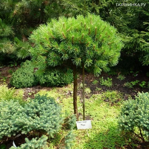 Сосна горная Мопс на штамбе 80 см - Форма кроны сосны округлая, шаровидная, хорошо поддается формированию. Годовой прирост составляет 2-8 см, сильно ветвится. Тонкие, коричневые, смолистые почки образуются разной величины, длиной 1-2 см, располагаются плотно. Хвоинки темно-изумрудные или сине-зеленые, размером 2-4,5 см на 0,2 см, в пучках собраны по 2 шт. Иголочки живут 3-5 лет, затем осыпаются, сменяются новыми листочками. Коричневые шишки имеют яйцевидную форму, длину 2-6 см. Корневая система разветвленная, поверхностная, чувствительная к уплотнению грунта.