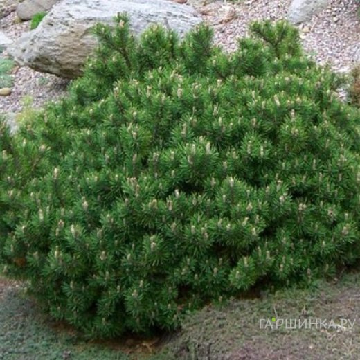 Сосна горная Гном - вечнозеленый, медленнорастущий, хвойник - природный полукарлик. Ствол плотный, прирост 6-7 см. Максимально достигает 2,5 м. Крона очень густая, шаровидная, затем куполообразная, самоформируется. Ветви равномерные, часто расположенные, отстоят от стволовых равномерно, серые, чуть шероховатые. Хвоя игловидная, окраска темно-зеленая, собраны в пучки, молодой прирост имеет более светлую окраску.