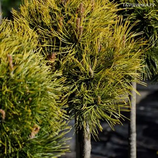 Сосна горная Голден Глоу на штамбе 40 см - карликовый хвойный кустарник с подушковидной кроной и желтой хвоей в зимний период. Крона асимметричная. В молодом возрасте форма кроны - плоско-округлая, во взрослом состоянии - раскидистая. Хвоя блестящая, длиной до 6 см., летом хвоя ярко-зеленая, осенью, с наступлением холодов, становится ярко-желтой. Предпочитает солнечные места, зимостойка. Рекомендуется для одиночных и групповых посадок в рокариях, альпинариях, в ландшафтных композициях. Хорошо смотрится в сочетании с темно-зеленой листовой, на фоне других хвойных растений в зимний период.