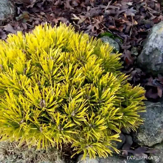 Сосна горная Mops Gold - вечнозеленый, медленнорастущий, хвойник - природный карлик. Ствол плотный, прирост слабый 5-6 см, достигшее взрослого возраста, при выполнении условий благоприятных для выращивания медленнорастущая форма 0,8м. Крона очень густая, шаровидная, затем куполообразная, самоформируется, с возрастом густая, объемная, правильная. Ветви равномерные, часто располженные, отстоят от стволовых равномерно, серые, чуть шероховатые. Хвоя игловидная, окраска зеленая, осенью ярко-золотисто- желтая, очень короткая, собрана в пучки, молодой прирост имеет более светлую окраску.