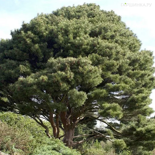 Сосна густоцветковая Умбракулифера - хвойное растение. К 10 годам вырастает до 1,0 м, взрослое растение, при благоприятных условиях выращивания имеет высоту 3.0м. Годовой прирост в среднем 9-10 см, один раз в год. Окраска молодого прироста светло-зеленая, зрелая хвоя ярко-зеленая, иголки собраны по 2. Крона зонтикообразная.