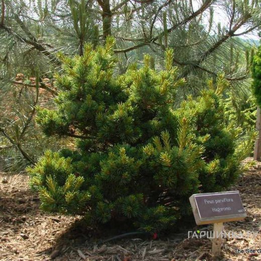 Сосна мелкоцветковая Хагоромо - вечнозеленый, медленнорастущий, хвойник. Ствол прямостоящий, прирост медленный 10-15 см. Растение, достигшее взрослого возраста, при выполнении условий, благоприятных для выращивания, высотой 6,0м. Крона широкопирамидальная, самоформируется, с возрастом густая, асимметричная. Ветви неравномерные, часто расположенные, отстоят от стволовых равномерно, чуть шероховатые. Хвоя игловидная, жесткая, окраска ярко- зеленая, скручена, собрана в пучки, молодой прирост имеет более светлую окраску.