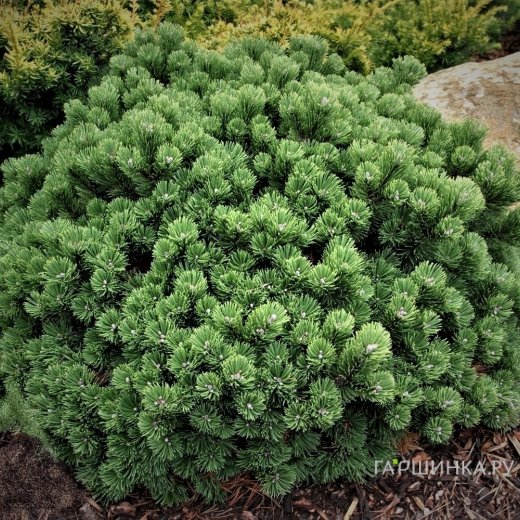 Сосна горная Шервуд Компакт - карликовый компактный хвойный кустарник с подушковидной кроной. Высота растения до 0,9м, диаметр 1,2м. Растет медленно. Годовой прирост 5-6см. Хвоя длиной 4,5—5,5см, ярко-зеленая в течение всего года, жесткая.