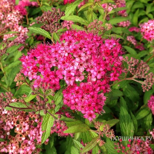 Спирея Антони Ватерер японская - Это маленький кустарник высотой 0,6-1 м, шириной 0,6-0,8. Крона компактная, куполовидная, образована вертикально растущими или слегка свисающими побегами. Цветы карминные, собраны в щитковидные соцветия до 15 см в диаметре. Цветение обильное и продолжительное с конца июня до сентября. Листья ланцетные, при распускании имеют красноватый оттенок, позднее ярко-зеленые, отдельные листики имеют желтые или розовые прожилки. Осенью листья приобретают яркую окраску от оранжевой до кирпично-красной.