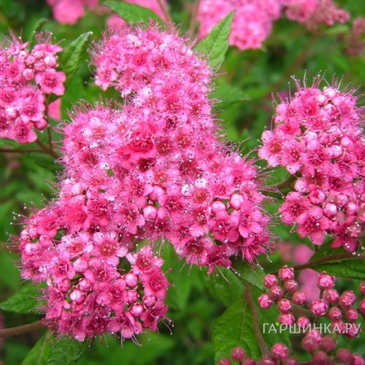 Спирея Бумальда - Высота растения достигает примерно 1 м. Листовые пластины куста небольшие, имеют яйцевидную форму, в зависимости от сезона их описание видоизменяется: весной они светло-зеленые, а осенью делаются красно-оранжевыми или зеленовато-коричневыми. Крона кустарника округлая, с прямыми, ребристыми ветками. Компактные соцветия формируются из мелких цветков, окрашенных в сиренево-розовые тона, хотя некоторые сорта могут обладать более светлой окраской: белой или бело-розовой. Период цветения длится с июня по сентябрь, время главным образом зависит от климатических условий региона, где культивируется растение. Кустарник отличается высокой морозостойкостью, устойчивостью к засухе и нормальной переносимостью загазованного воздуха, что позволяет высаживать его в больших городах.