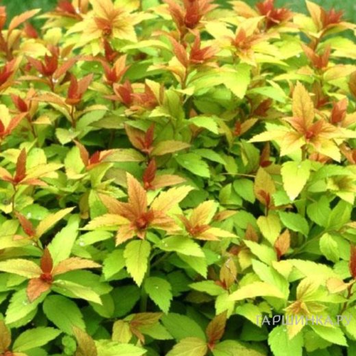 Спирея японская Грин энд Голд - кустарник, высотой и шириной до 1,2 м. Побеги прямые. Листья крупные, продолговато-овальные. С ранней весны молодые листочки при распускании розоватые, буро-оранжевые, постепенно становятся желто-зелеными, к середине лета приобретают зеленую окраску с редкими желтыми пятнами. Осенью листья приобретают пурпурно-золотистую окраску. Цветет с июля до начала сентября. Цветки ярко-розовые, собранные в крупные плоские щитки. В конце осени может дать еще один всплеск цветения, но уже не так обильно. Сорт неприхотливый. Высокая зимостойкость. Зона 4.