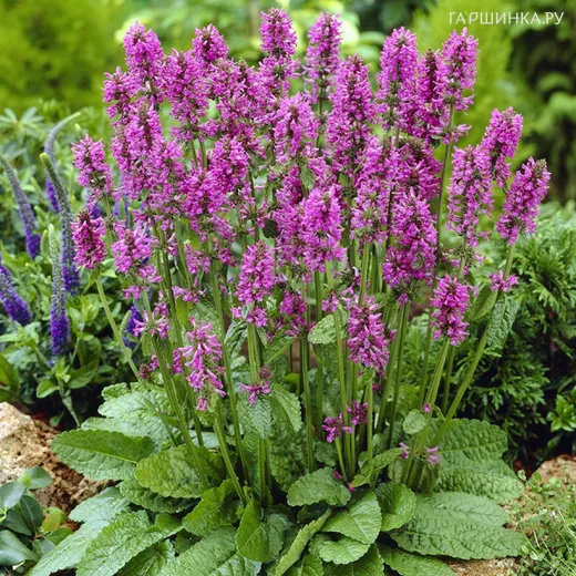 Стахис Монье Хуммело - эффектный, декоративный, неприхотливый многолетник, образует плотный ковер. Растение почвопокровное 0,5 м. Окраска цветка ярко-фиолетовая. Соцветия колосовидные, плотные, многочисленные, прочные. Лист прикорневой, толстый, широколанцетный, зеленый.