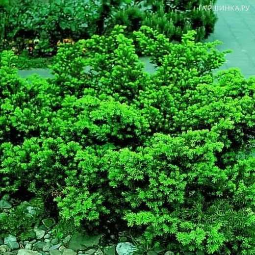 Тис остроконечный Нана - декоративный, медленнорастущий хвойник - природный долговечный карлик. Ветви широко распластанные, сильные, крона низкая, форма неправильная. Побеги густые, жесткие, укороченные до 1м. Хвоя линейная, игловидная, заостренная, ориентирована радиально, густо покрывает побеги, окраска темно-зеленая 2-3 см. Корни обильно ветвятся, сильные, распростертые. Хорошо переносит формирование и стрижку.