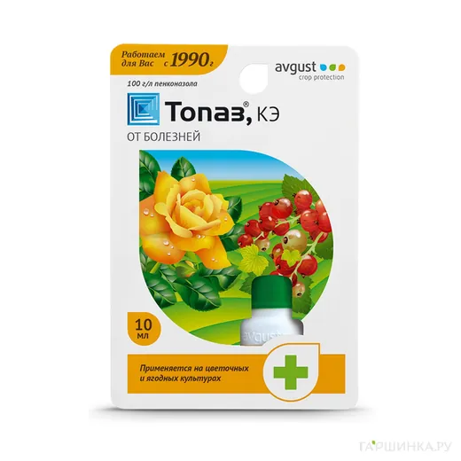 Топаз 2мл (от мучнистой росы и плодовой гнили) - фунгицид широкой сферы применения. Используется для борьбы с грибковыми заболеваниями плодовых деревьев, ягодников, овощей и цветов. Препарат длительного периода действия и высокой эффективности даже при низких температурах и присутствии влаги, действие быстрое. Токсичность низкая, применяется на любом этапе вегетации. Можно применять и в профилактических целях. Применяется при заболеваниях: ржавчина, мучнистая роса, пурпурная пятнистость, серая гниль. Следует соблюдать технику безопасности, Норму фунгицида выбирают согласно инструкции, в зависимости от вида заболевания и растений, подлежащих к обработке.