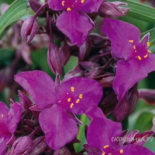 Традесканция Ред Грейп . Листья зелено-голубые, цветки лилово-красные. Высота 60 см, ширина 20 см. Цветение июль-сентябрь. Зона 4 (-34 / -29 °C).