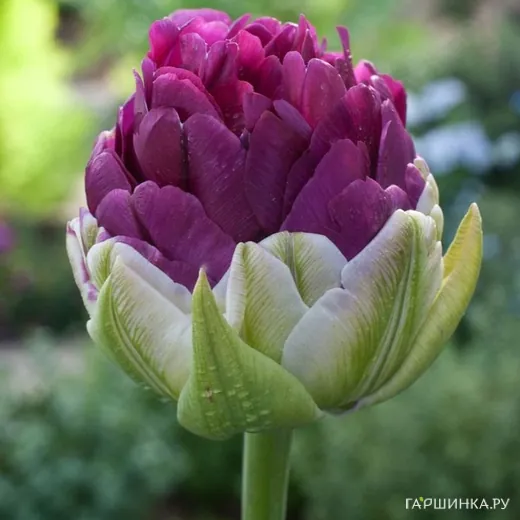 Тюльпан Эксквизит 5шт махровый - позднецветущиий сорт. Цветок густомахровый, пионовидный. Фиолетовая верхушка бутона обрамлена зелеными наружными лепестками. В полном раскрытии тюльпан становится равномерно фиолетовым с большим количеством лепестков. Высота 45 см, диаметр цветка – 8-10 см, цветение в мае.