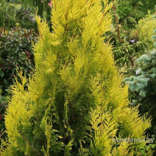 Туя Голди складчатая - считается одним из самых ярких сортов с изумительно красивой золотисто-желто-зеленой хвоей, сохраняет окраску даже в зимний период. Не нуждается в обрезке, достигая 2 метров сохраняет правильную конусообразную форму. Хорош для одиночной посадки на видных местах, используют для контраста в невысоких живых изгородях, при создании различных ландшафтных композиций.