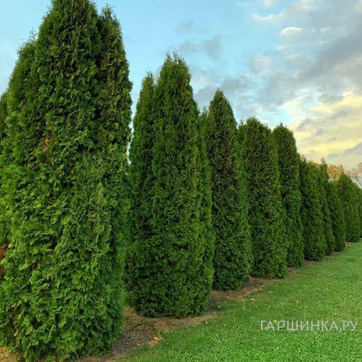 Туя западная Колумна - компактное дерево с красивой конической формой кроны, декоративное круглый год. Высота 5-8 м, диаметр кроны до 1,5 м. Ежегодный прирост в высоту 15 см, в ширину 5 см. Крона коническая, густая. Хвоя чешуйчатая темно-зеленая блестящая, сохраняет окраску зимой. Самая большая скорость вертикального роста среди всех видов и сортов туй. Самый ценный сорт туи для создания высоких живых изгородей выше 5 метров без стрижки.