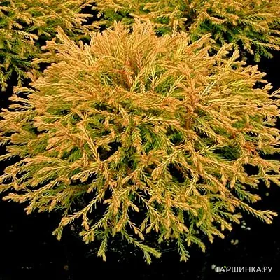 Туя западная Голден Таффет - Карликовая подушковидная форма, напоминает шляпку гриба. Карликовый хвойный кустарник с золотистой, шаровидной, чуть приплюснутой кроной. Структура хвои напоминает плетение, что придает растению изящный вид и создает визуальное впечатление ажурности. Растёт очень медленно, к 10-ти годам высота 60 см, ширина 100 см. Побеги тонкие, короткие, гибкие, повисающие. Хвоя золотисто-оранжевая, на солнечном месте интенсивно окрашенная, сохраняет окраску и зимой. Рекомендуется для альпинариев и контейнеров. Следует отметить, что к зиме туя теряет свой золотистый цвет и приобретает темный, бронзовый оттенок. Однако с наступлением весеннего сезона, крона растения вновь становиться золотисто-оранжевой.