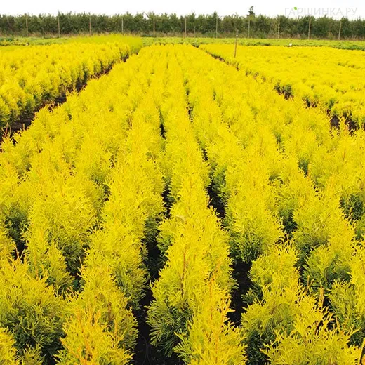 Туя западная Мария - Хвойное декоративное вечно зелёное компактное растение с насыщенной кроной с золотисто-желтой хвоей, сохраняющей цвет в течении года. Туя имеет симметричную коническую крону. Отличается хвоей золотисто-жёлтого цвета, которая ближе к стволу переходит зеленый, не подгорает летом и не меняет цвет зимой. Побеги прямые вертикальные, сильно разветвлённые. Веточки плоские, широко распространённые, густо расположены во всех направлениях. Растёт медленно, годовой прирост около 20 см, к 10-ти годам высота 150 см.