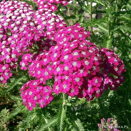 Тысячелистник Саммервайн - длительно цветущий неприхотливый многолетник. Высота 70-75 см. Цветки бордовые или винно-красные со светлым центром. Цветок не выгорает на солнце. У сорта серо-зеленые с шерстистой текстурой листья зубчатые, перисто-рассеченные, расположенные в очередном порядке. Цветет с июля 40-45 дней.