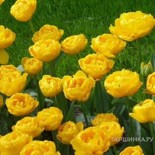 Тюльпан Голд Февер 5 шт Период цветения тюльпана этого сорта приходится на вторую половину мая. Образует на прочном цветоносе пышный, крупный цветок лимонно-желтого оттенка, форма бокала чашеобразная. Лепестки волнистые, расположены хаотично, словно бутон пиона. Диаметр цветка 10-12 см, высота бокала 6-8 см. Высота тюльпана достигает 40-45 см.