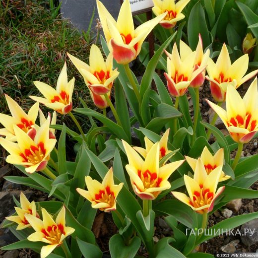Тюльпан Корона Кауфмана 5 шт. - это карминно-розовый румянец на желтом фоне снаружи бокала, а внутри лепестки лимонно-желтые, с красной "короной" над желтым донцем. Высота бокала: до 7 см. Высота растения: до 20 см. В полуроспуске цветок похож на корону. Листья зеленые, с темными полосками.