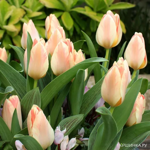 Тюльпан Литл Герл Грейга 5шт Высота растения до 18 см. Цветок крупный с широким основанием и слегка отогнутыми наружу кончиками лепестков, декоративная листва. Окрас цветка: кремовое основание, нежнейшее розовое напыление.