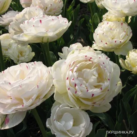 Тюльпан Дэнс Лайн 2 шт зацветает в середине мая. Множественные, плотные, кремово-белые лепестки, на кончиках которых присутствует малиновый штрих. В начале цветения лепестки зеленовато-белые. На внешних лепестках так и остается широкая зеленая полоса по центру. Постепенно цветок приобретает фарфорово-белый цвет, который подсвечивается изнутри желтыми тычинками и таким же желтым донцем. Высота 40-50 см.