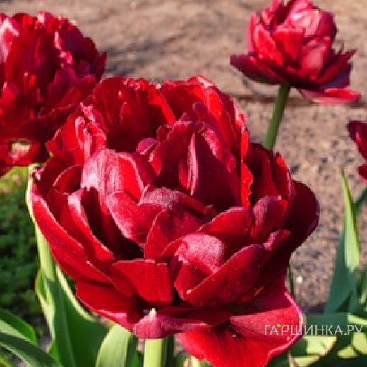 Тюльпан Emblazon относится к махровым поздним сортам. Цветет в мае, образуя пышный густомахровый пунцово-красный бутон, высотой до 8 см. В раскрытом виде цветок достигает в диаметре 8-10 см. Продолжительность цветения тюльпана Emblazon до 2-3 недель. Высота цветоноса 40-50 см.