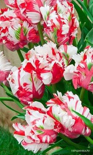 Тюльпан Эстелла Рижнвельд попугайный 5шт Цветет в конце мая, образует экзотический, сильно гофрированный бокал, соединяющий в своей окраске малиново-красные и кремово- белые "всплески", высота цветка около 7 см, в диаметре 12-15 см. Продолжительность цветения до 2-3 недель. Высота 40-50 см.