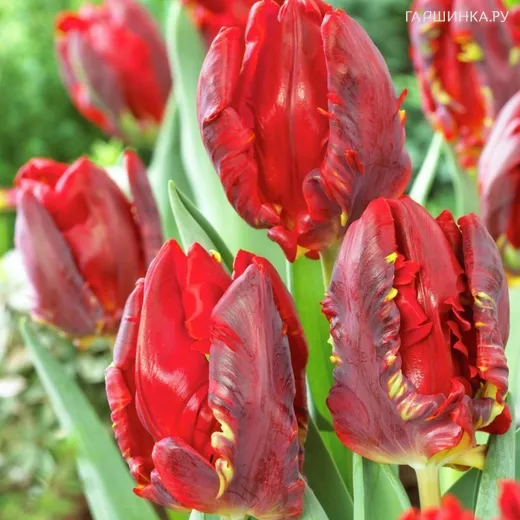 Тюльпан Рококо попугайный 5шт цветет в мае, образуя красный с желто-зеленым основанием бутон высотой около 8 см. и диаметром до 20 см. Продолжительность цветения - от 10 дней. Особенностью этого сорта являются ошеломляющие как по цвету, так и по форме цветки с крылатыми слегка рассеченными и словно гофрированными лепестками. Продолжительность цветения - до 2-3 недель. Высота растения до 50 см.