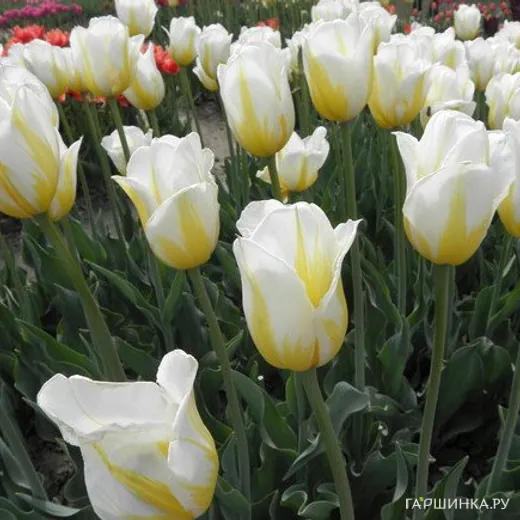 Тюльпан Фламинг Кокет 5шт Цветет в апреле-мае. Цветок бело-желтый, пестрый с высоким бокалом (до 10 см). Обладает средней скоростью роста, подходит как для озеленения и украшения клумб, так и для букетов, отлично растет на хорошо освещенном месте и в полутени. Высота 45 см.