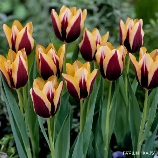 Тюльпан Гавота Триумф 5шт Период цветения приходится на май. На прочном цветоносе образуется высокий бокал вишневого оттенка с широкой ярко-желтой каймой по краям. Высота бокала 6-8 см, диаметр цветка 10 см. Продолжительность цветения одного цветка 10-12 дней. Высота тюльпана достигает 45-60 см, стебель прямой, прочный.