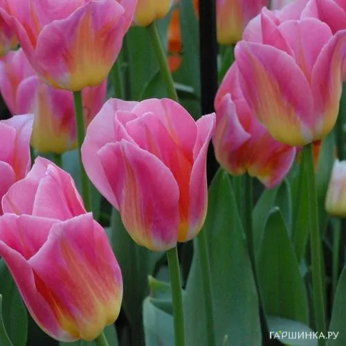 Тюльпан Том Пус Триумф 5шт. Высота  до 50 см. Цветок ( высотой до 7 см )меняет насыщенность, в  начале своего цветения основание лепестков сливочное, а на краях розовеет кайма. Постепенно насыщаясь, кант приобретает ярко-розовый цвет, переходящий сначала в коралловый, а затем в оранжевый гаснущий в жёлтом.