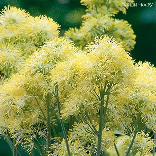 Листья растения имеют сизый оттенок, который придает ему особую декоративную ценность. Они сложные, перистые, с небольшими долями, что добавляет растению воздушности. Цветки василистника желтого сизого мелкие, собраны в метельчатые соцветия, и окрашены в нежный желтый цвет. Цветение начинается в июне и продолжается до июля, привлекая множество насекомых-опылителей, что способствует поддержанию биоразнообразия в вашем саду.