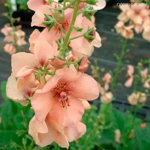 Вербаскум (коровяк) Джеки - многолетнее растение до 50 см высотой. Стебли одиночные, прямостоячие, облиственные. Листья цельные, собраны в прикорневую розетку. Листья и стебли большей частью опушенные. Цветки правильные, распростерто-колосовидные, лососёво-абрикосово-розовые, собраны в кистевидные или колосовидные, ветвистые соцветия. Период цветения - с июня по август.