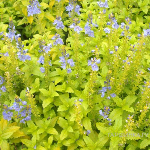 Вероника простертая Ацтек Голд - многолетник, образующий густые куртины высотой 20 см. Побеги многочисленные. Цветки диаметром до 1 см, небесно-голубые, в колосовидных соцветиях. Цветение в июне-июле. Листочки заострённые, салатовые или зеленовато-салатовые. Используется как почвопокровное или контейнерное растение. Место солнечное или полутенистое. Почва влажная, дренированная. Зона 4 (до -34ºС).