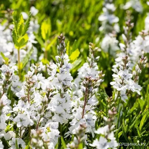 Вероника простертая Альба - Серовато-зеленое многолетнее травянистое растение, образующее плотный ковер до 10 см высоты со стержневым корнем. Стебли многочисленные, бесплодные - лежачие, цветущие - восходящие. Листья 1-2 см длины. Растение сохраняется зеленым зимой. Растет на любой рыхлой садовой почве. Солнцелюбива, но теневынослива. Размножают семенами или вегетативно - черенками. Подходит для создания куртин, посадки на подпорных стенках и террасах каменистых садов, для декорирования миксбордера.
