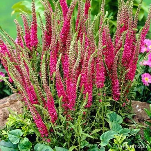 Вероника колосистая Ротфукс - многолетнее травянистое растение. Высотой всего 35 - 40 см. Колосовидные соцветия из множества мелких малиновых цветков.