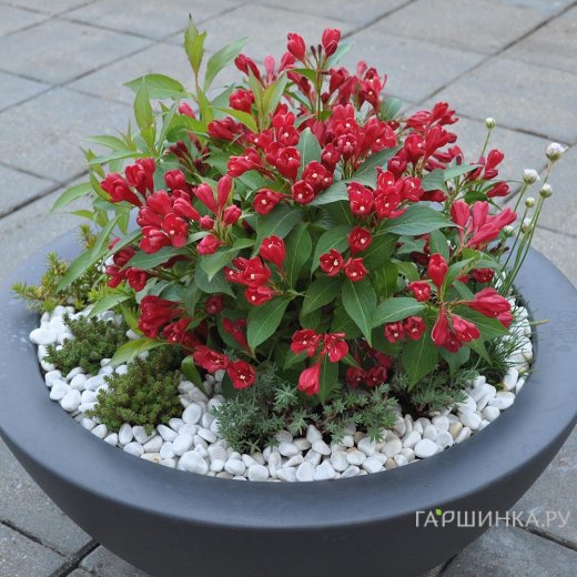 Использование вейгелы в дизайне сада. Использование вейгелы разнопланово: это куртины на газоне, одиночные растения на опушке или под редко стоящими деревьями с ажурной кроной, низкорослые сорта пригодны для каменистых участков, высокорослые вейгелы эффектны в живой изгороди. Если в вашем распоряжении имеется около десятка растений, то их можно разместить в виде одной-трех групп в зависимости от видового или сортового разнообразия и композиционного решения участка. В одной группе рекомендуется высаживать по 3-5 экземпляров, живописно разместив их на газоне. Группа должна состоять из растений одного вида или сорта, гармонично сочетающихся по окраске цветков, по форме и размерам кустов, по срокам цветения. Рекомендуется для растений, посаженных в группы, устраивать общий приствольный круг, который обязательно мульчируют. Если группа рыхлая, то пространство между кустами вейгелы засаживают многолетниками: хостой, астильбой, папоротниками, которые будут украшать сад в течение всего лета.
