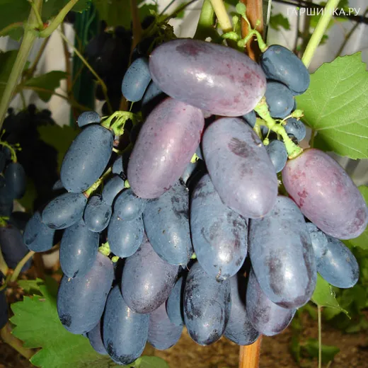 Виноград Кодрянка сладкий ранний - сверхраннеспелый сорт. Куст сильнорослый, рост быстрый, может использоваться в качестве декорирования, молодой лист красный. Лоза высокорепродуктивна. Гроздь коническая, среднеплотная, 600 гр. Ягода округлая, темно-фиолетовая, крупные 6-8 гр, восковой налет. Кожа плотная, но съедается легко. Мякоть ягоды сочная, кисло-сладкая, внутри несколько косточек, имеет мускатный аромат. Сорт винный, урожайность и транспортабельность очень высокая.