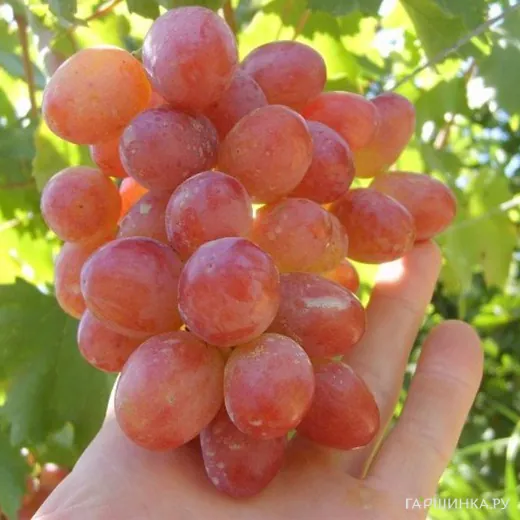 Виноград Анюта столовый - морозостойкий, среднеспелый сорт. Куст сильнорослый, рост быстрый, может использоваться в качестве декорирования , молодой лист красный. Лоза высокорепродуктивна. Гроздь конически-цилиндрическая, рыхлая, 1200 гр. Ягода овально-удлиненная, интенсивно-розовая, 10-15 гр. Кожа не жесткая, съедается легко. Мякоть ягоды сочная, кисло-сладкая, внутри несколько косточек. Сорт столовый, урожайность и транспортабельность очень высокая.