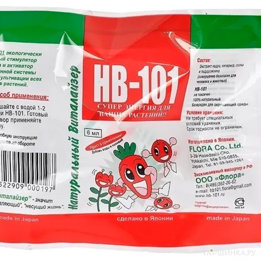 HB-101 – полностью натуральный экстракт, полученный из той части растения, который наиболее важен для его правильного развития. HB-101 питает растение, обеспечивая его рост, цветение и урожайность. Он не является химическим удобрением. HB-101 – 100% органический продукт, безопасный для растений и животных, созданный приносить пользу окружающей среде и сократить использование химических удобрений. Жидкая форма HB-101 обеспечивает его легкое и быстрое применение в виде разбавленных растворов.