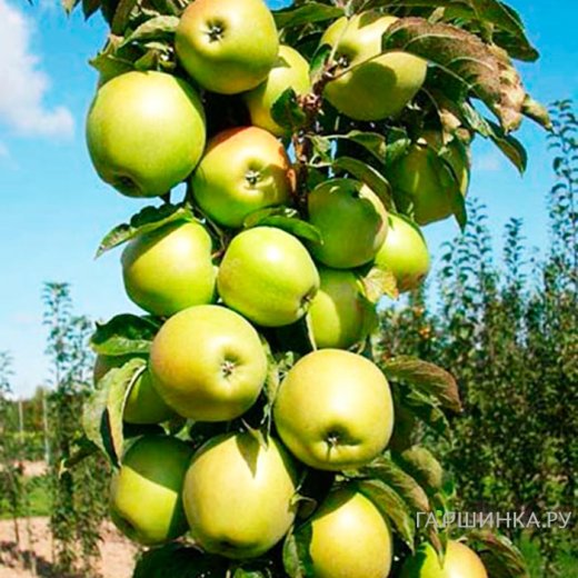 Яблоня Малюха колоновидная (лицензионная) - среднеосенний сорт, устойчив к холодам. Высота 2.5 м, ширина 0,4 м, ствол плотный, рост вертикальный, боковые ветви почти не формирует, мощная развитая корневая система, лист ярко-зеленый. Плод округло-вытянутый, желто-зеленый, со светло-красным румянцем на боку, 250 гр, мякоть светлая, вкус кисло-сладкий, грушевый, сочный, присутствует приятный аромат, десертный. На одном дереве созревает очень много плодов, плодоношение ежегодное, первое в год посадки. Товарность и транспортировка высокая, лежкость до декабря-января.