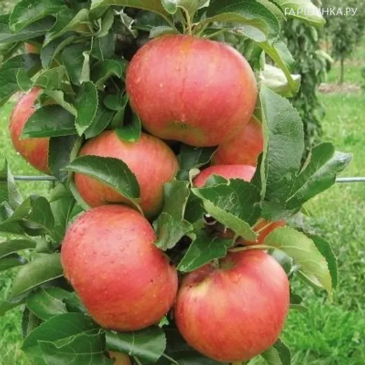 Яблоня Триумф колоновидная (лицензионная) - среднеспелый сорт, устойчив к холодам, плодоношение на кольчатках и стволе. Высота 2.0 м, ширина 0,4 м, ствол плотный, рост вертикальный, боковые ветви почти не формирует, мощная развитая корневая система, лист ярко-зеленый. Плод округлый, слегка приплюснутый, темно-красный, 150 гр, мякоть белая, вкус сладко-конфетный, с медовым послевкусием и нежной кислинкой, сочный, присутствует приятный аромат, десертный. На одном дереве созревает очень много плодов, плодоношение на 4-5 год после посадки. Товарность и транспортировка высокая, лежкость хорошая.